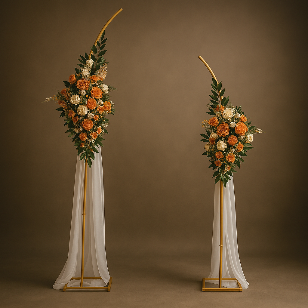 Composée de deux structures dorées asymétriques, cette arche florale offre un effet visuel élégant et contemporain. Les arrangements de roses orange et ivoire, agrémentés de verdure et de voilage blanc, créent un point focal raffiné pour une cérémonie, une allée ou un photobooth. Parfait pour un décor chaleureux, chic et inoubliable.